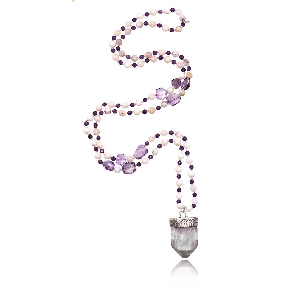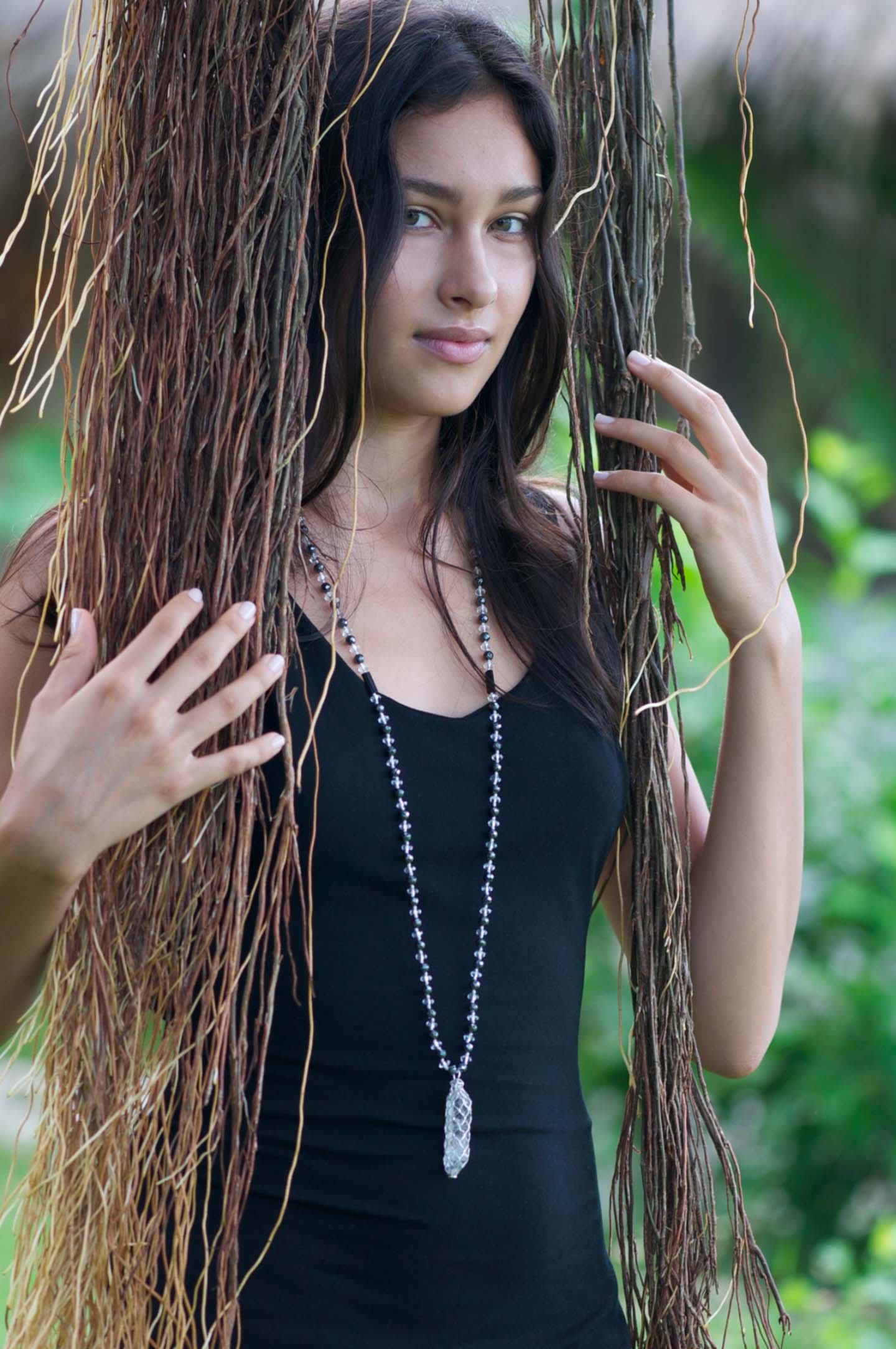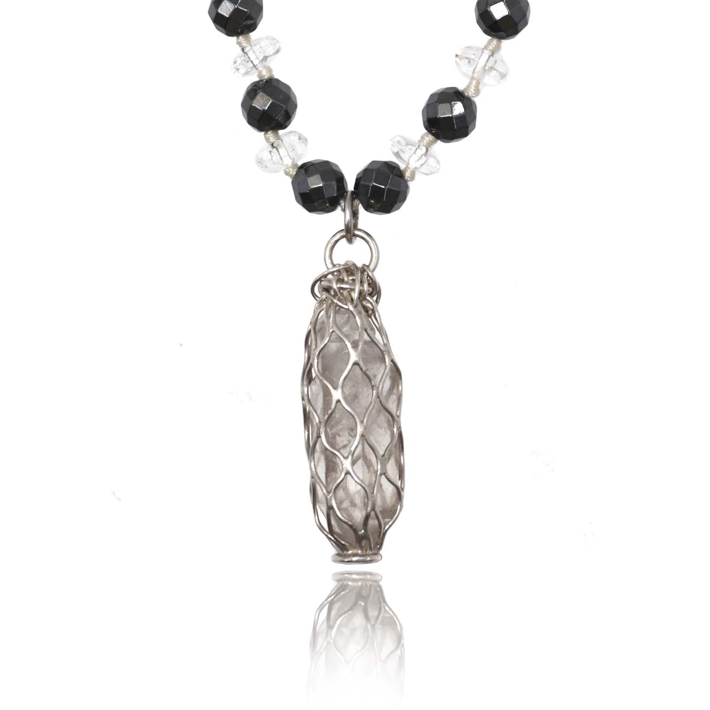 The combination of metallic black Hematite beads and Crystal Clear Quartz give a powerful color contrast; the mala is completed with a raw Crystal Clear Quartz pendant that is netted by silver wires for a unique look.
