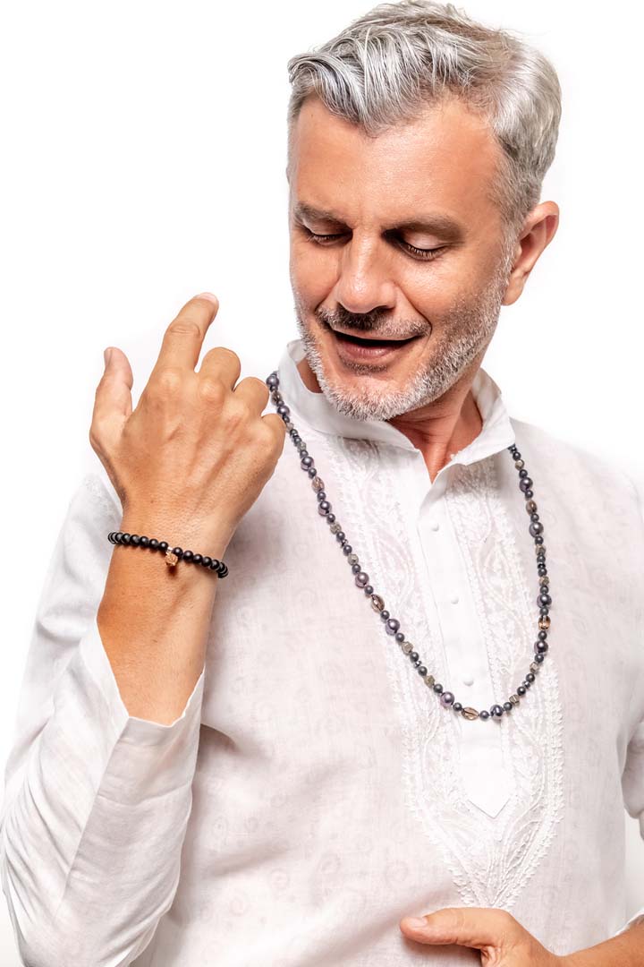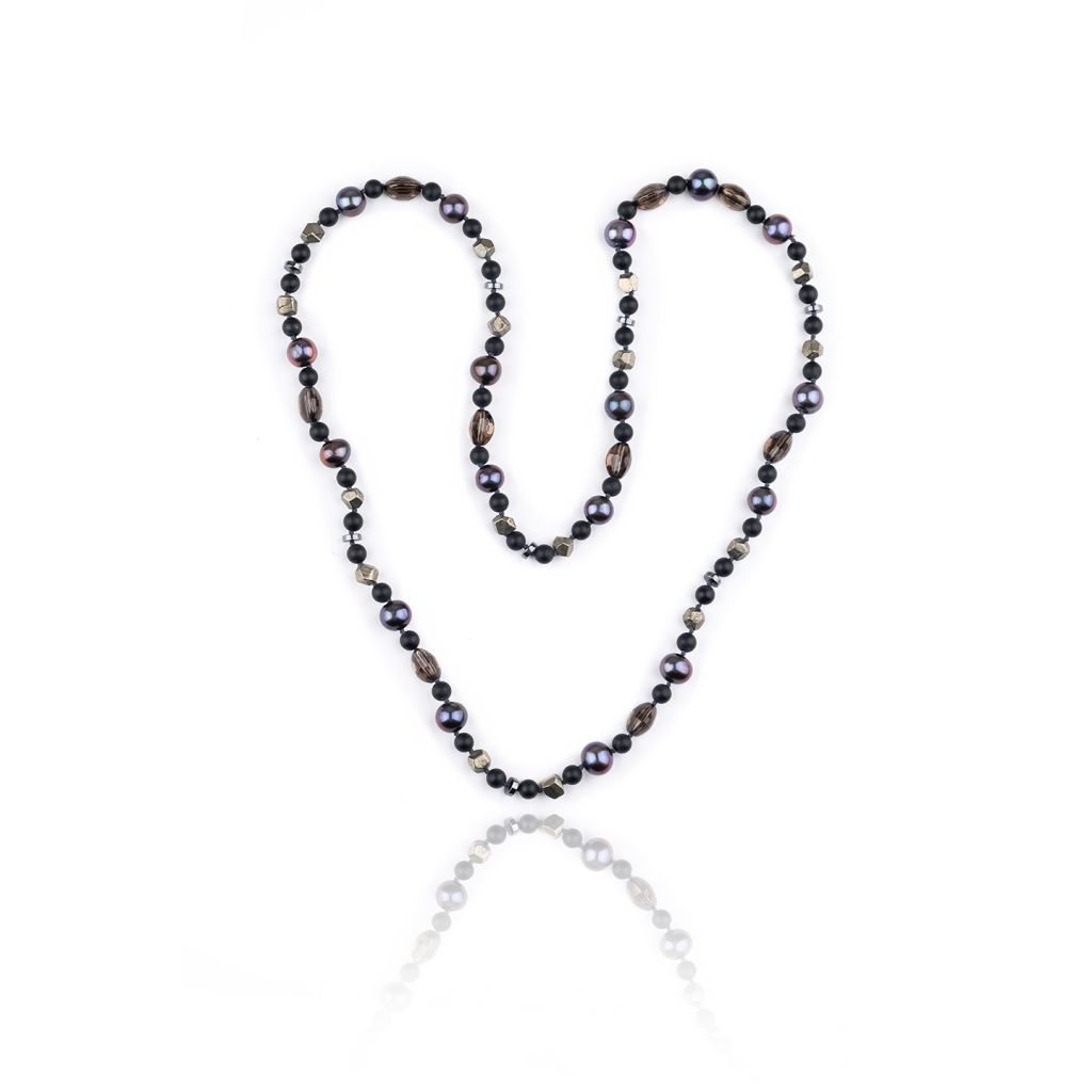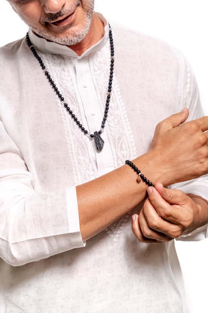 Jewel details: Frosted Onyx beads 6 mm and a Rudraksha seed, 9.9 gr.