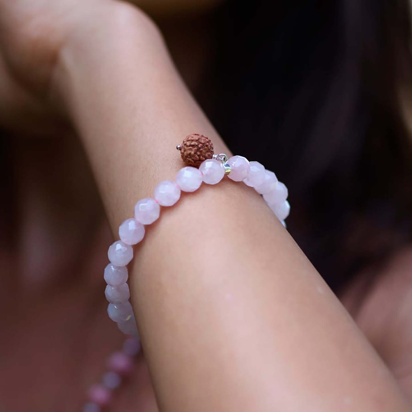 Jewel details: Elastic, Faceted Rose Quartz 8mm, Rudraksha set with silver 925, 17gr