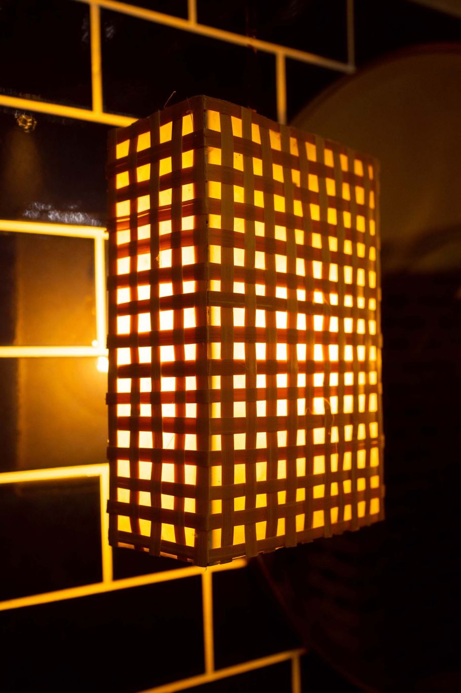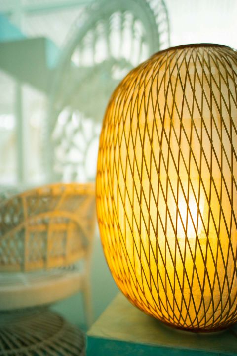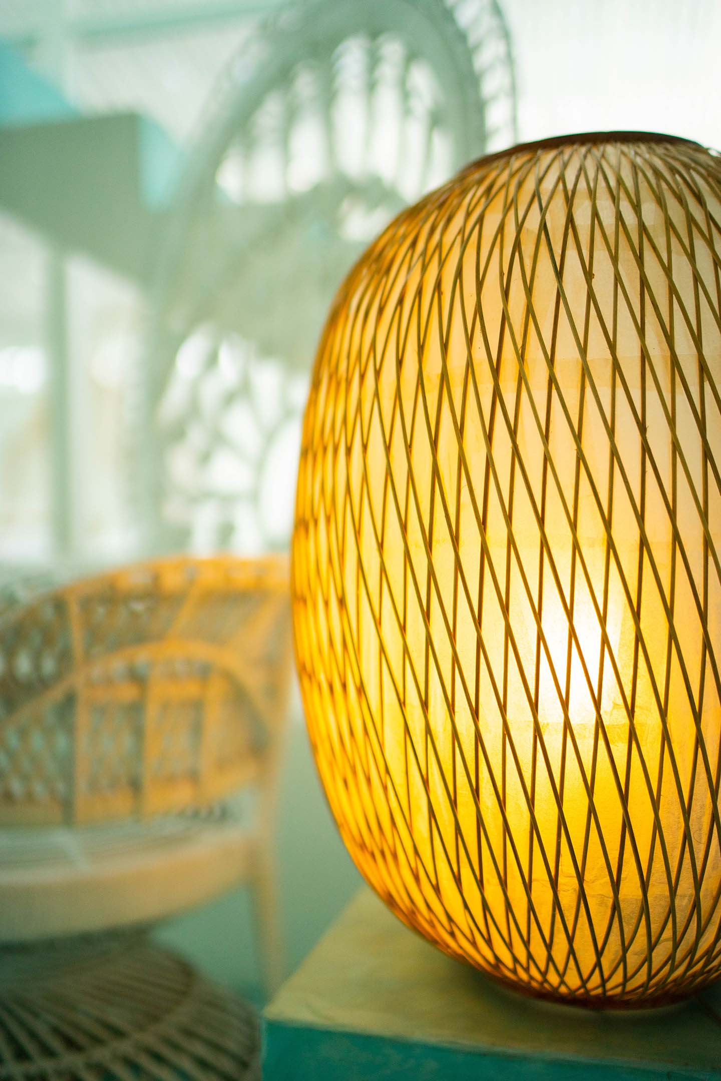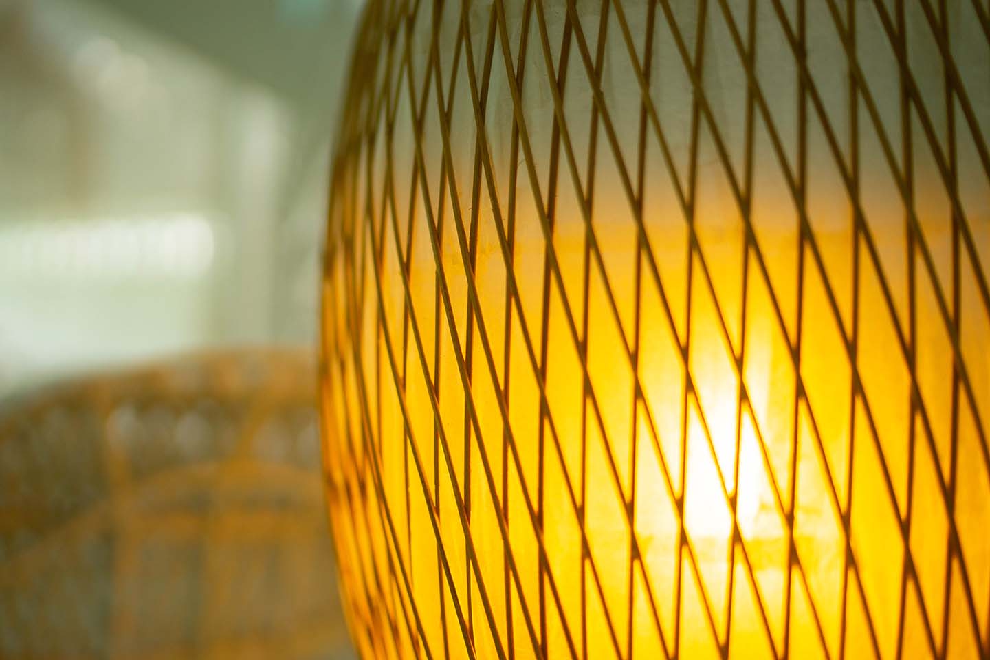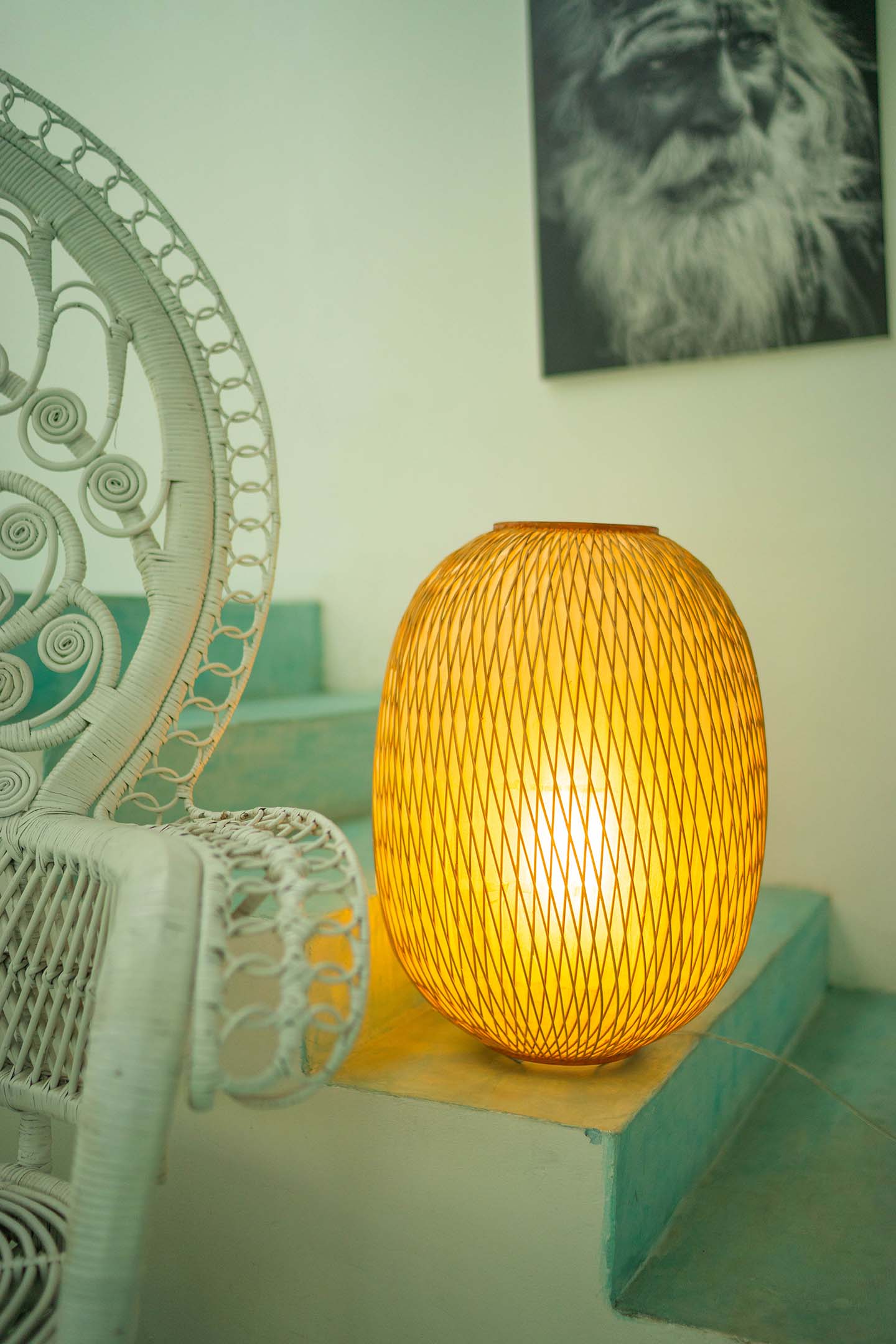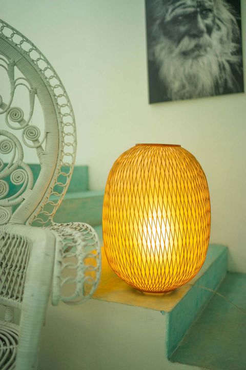 Internal fiberglass oval structure cover with coconut leaf fiber net and double wooden ring at top and bottom. All with natural matt coating finishing. (Including electric materials European standard with fitting E27 for LED light bulb only)