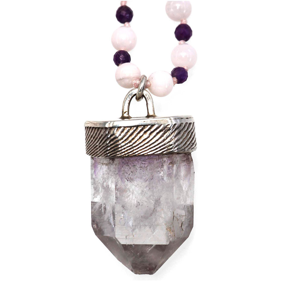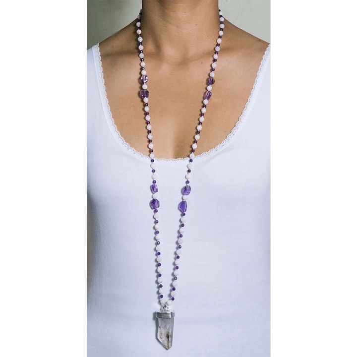 Long mala necklace with Brandenberg pendant set with Silver Cuttlefish casting, Pink Opal and Amethyst.
