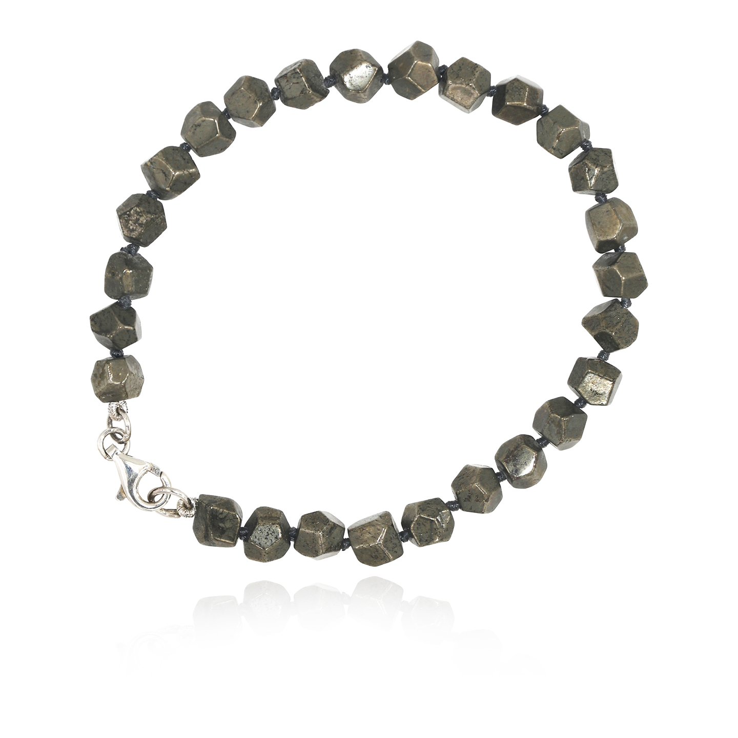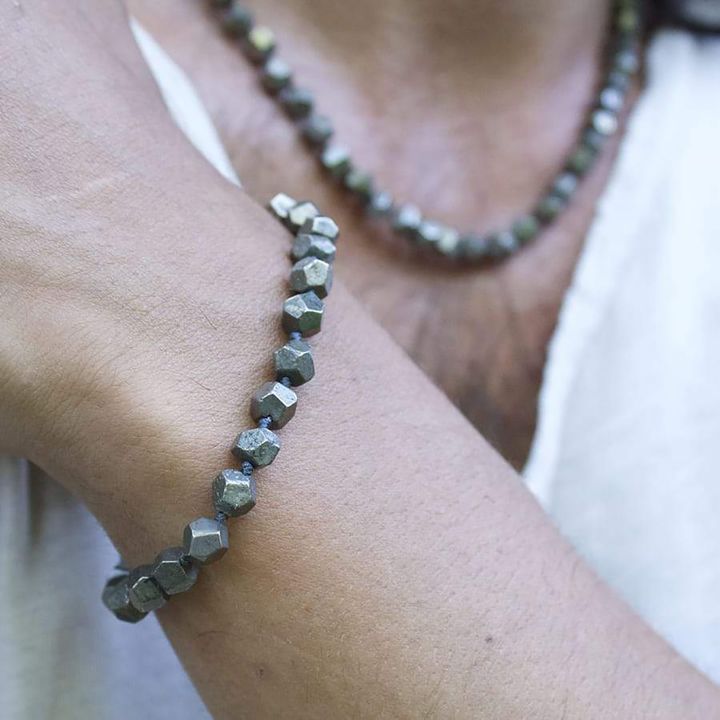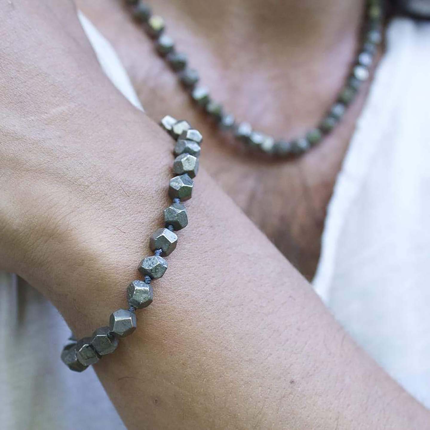 The hard rocky texture of the Pyrite is durable and fit to wear every day; the bracelet looks even more stunning in combination with the matching short necklace.