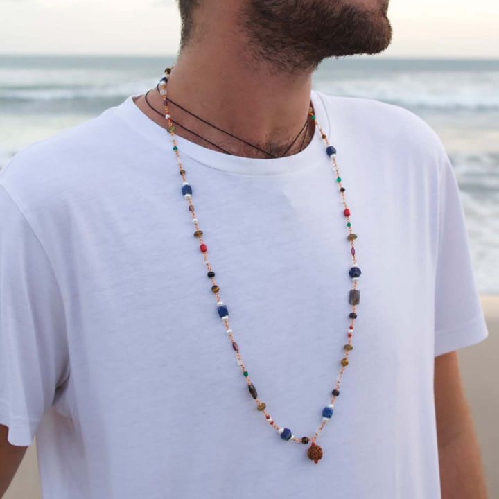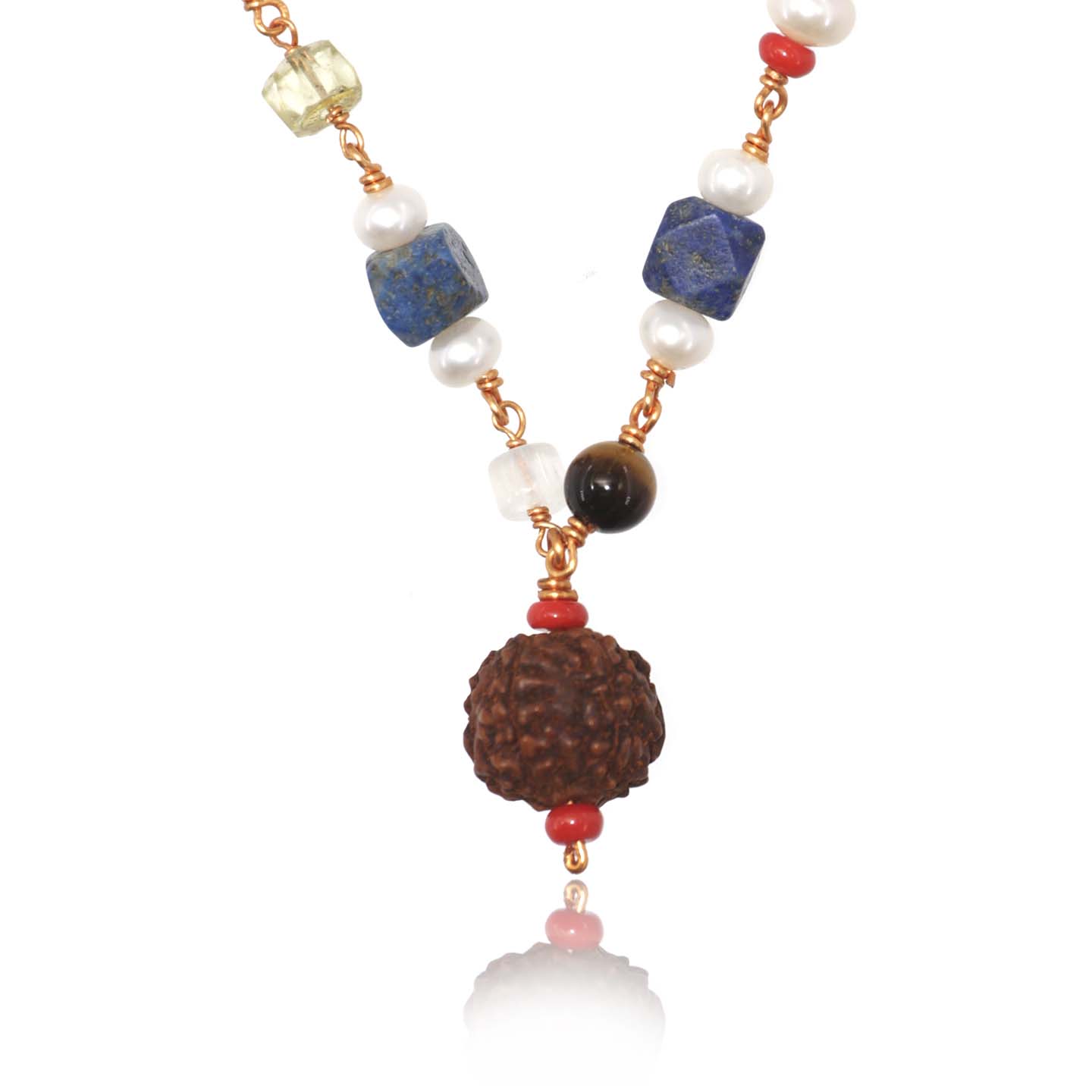 Jewel details: Pearls, Garnet, Smokey Quartz, Crystal Quartz, Green Onyx, Rainbow Moonstone, Green Garnet, Apatite Coral, Tiger Eye, Lapis Lazuli, Rudraksha, Copper Wire, 83cm long, 29gr