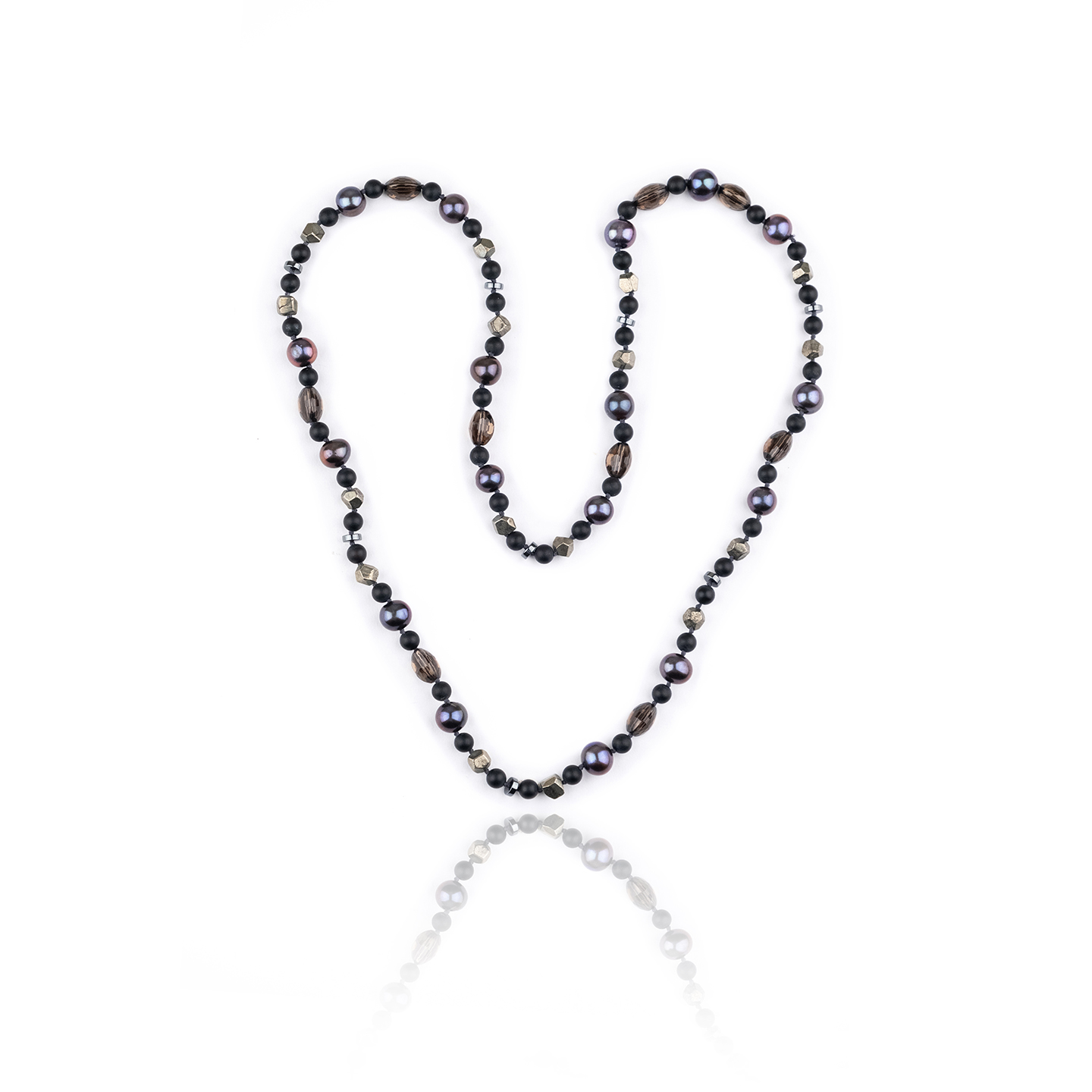 Jewel details: Mix of Onyx Frosted, Smokey Quartz, Pearls, Hematite, Raw Pyrite, 79 cm long, 67.5 gr.