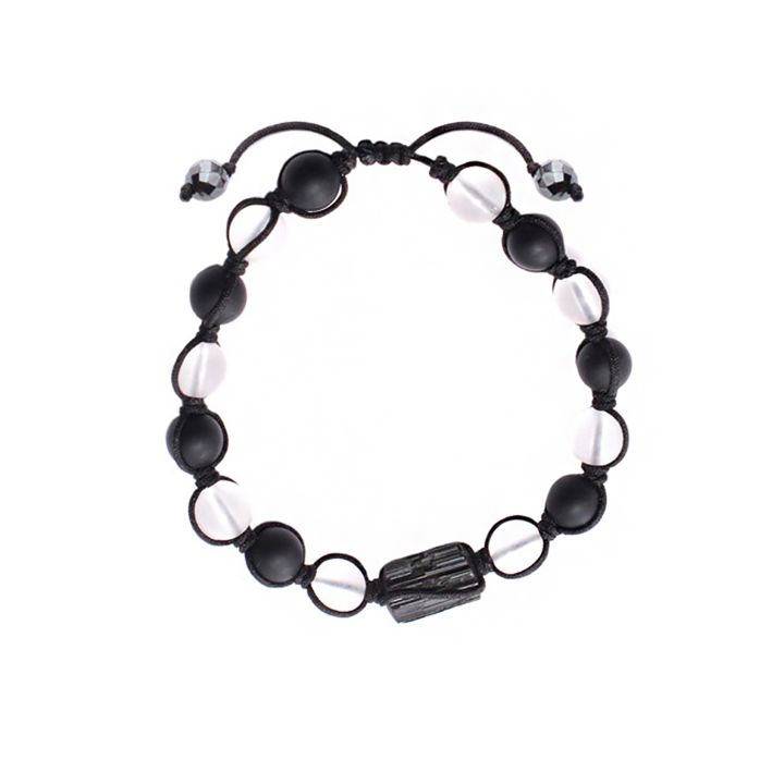 The frosted Black Onyx is in beautiful contrast with the frosted Crystal Clear Quartz, creating a perfectly balanced look of feminine and masculine. Black stones have protective energies in the sense that black is the absence of light, and therefore, can be used to create invisibility.