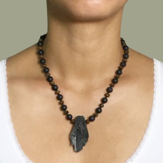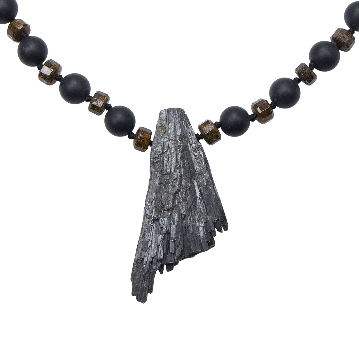 This necklace made with Onyx frosted, Bronzite and black Kyanite pendant for protection.